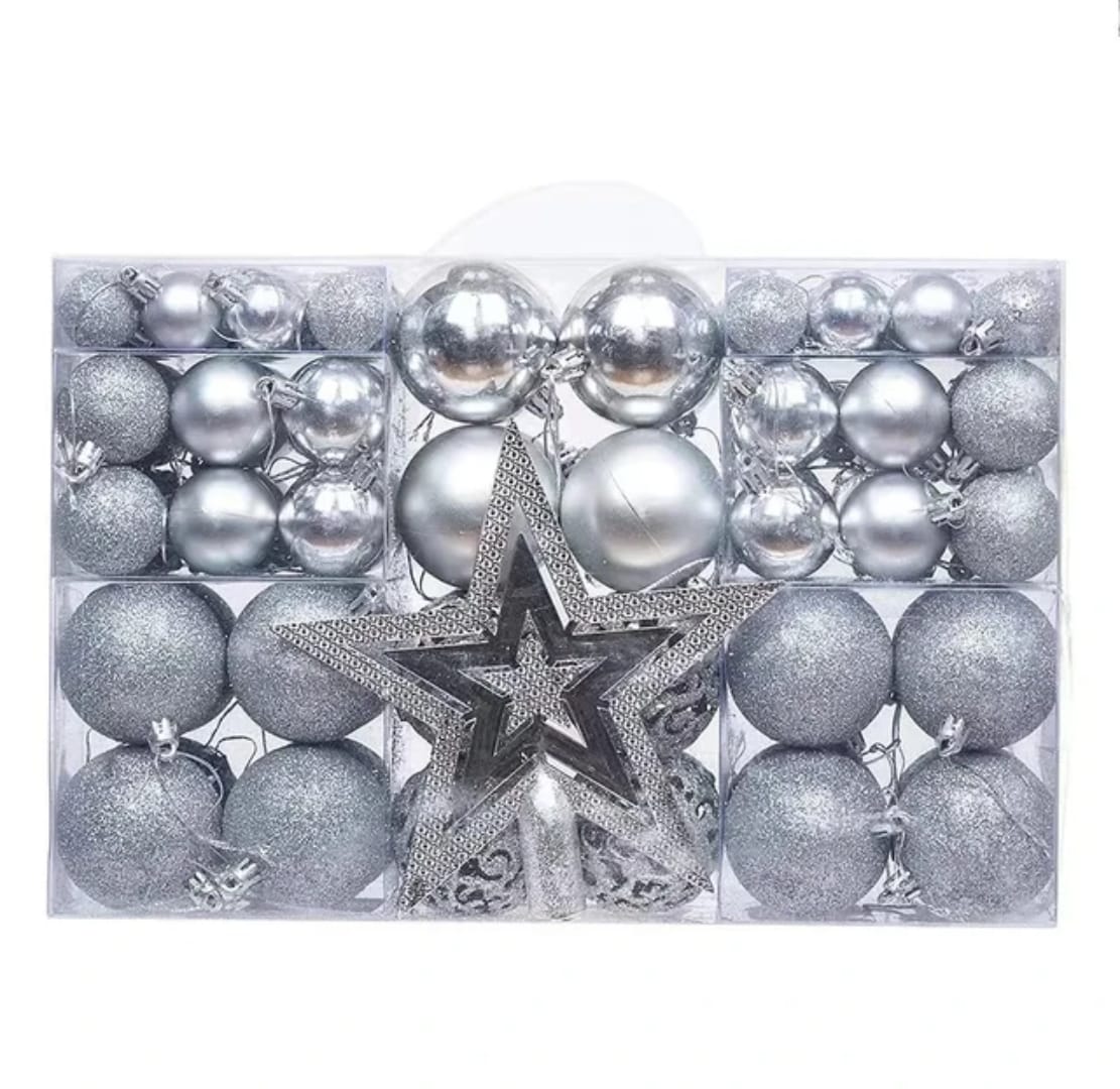Each set includes a mix of 3 sizes of ornaments — large, medium, and small — along with a matching decorative star topper to complete the festive look. Made from high-quality, shatterproof plastic, these ornaments combine safety, durability, and style — perfect for homes with kids or pets.