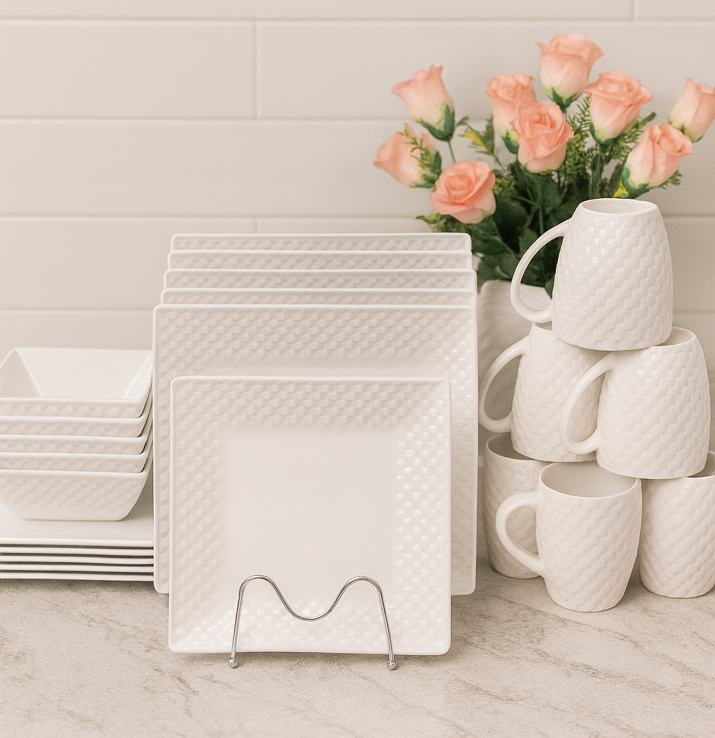 Add elegance and modern charm to your dining table with this 24-piece premium white ceramic dinner set. Designed with a textured checkered pattern and a sleek square shape, this set combines timeless sophistication with everyday practicality — perfect for family meals, entertaining guests, or gifting.