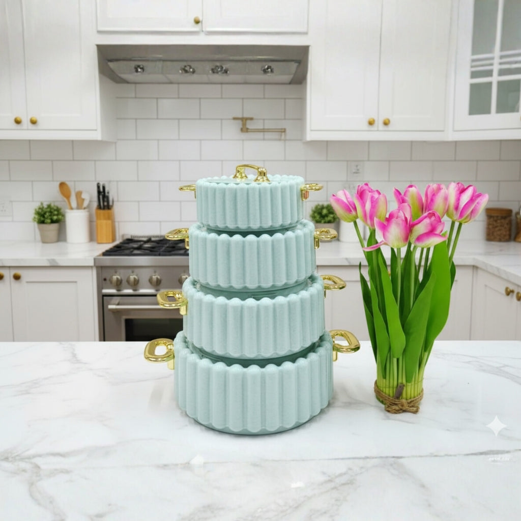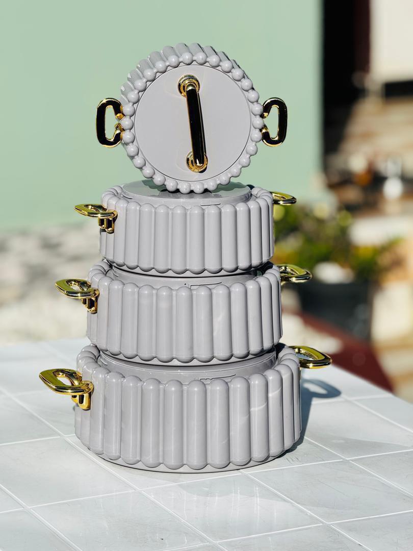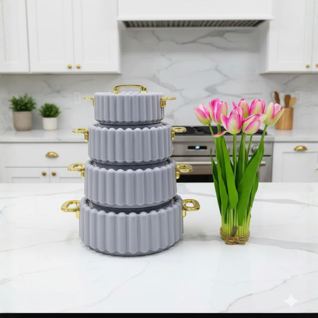 Serve in style with the elegant Gold Star 4-Piece Hot Pot Set, designed to keep your meals warm and your table looking luxurious. Crafted with a sleek ribbed design and finished in a soft grey tone with gold handles, this set blends modern sophistication with everyday practicality.